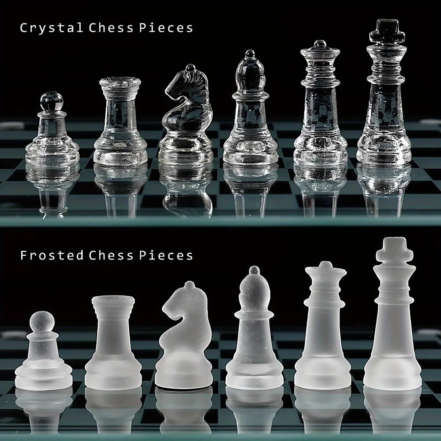 Crafted with crystal-clear precision, this elegant chess set features frosted and transparent glass pieces, offering a minimalist yet luxurious aesthetic. Each piece is weighted for balance and stability, resting gracefully on a mirror-glass board that adds a touch of brilliance to any room.